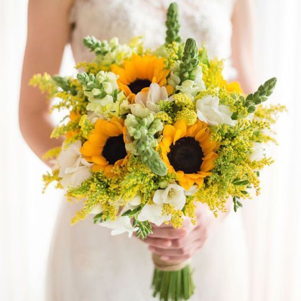 Hoa cưới hướng dương tượng trưng cho sự chung thủy, niềm tin và hy vọng về một tình yêu bền vững. Khi kết hợp cùng váy cưới trắng, bó hoa hướng dương giúp cô dâu thêm phần rạng rỡ và tỏa sáng.