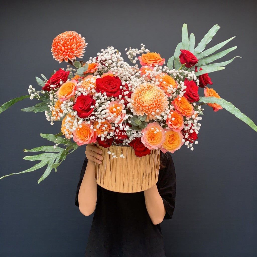 Bó hoa này nổi bật với phong cách hiện đại và sang trọng, thể hiện qua sự phối hợp màu sắc hài hòa và chọn lọc kỹ lưỡng. Những gam màu chủ đạo được chọn một cách tinh tế, từ những tông màu ấm áp đến những sắc thái nhẹ nhàng, tạo nên một tổng thể hài hòa và cuốn hút. Mỗi chi tiết nhỏ đều được chăm chút để tạo ra một tác phẩm hoa nghệ thuật đầy sức sống.