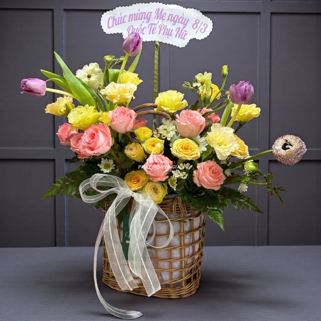 Bó hoa này được thiết kế với phong cách hiện đại nhưng không kém phần sang trọng, tạo nên một tổng thể hài hòa và tinh tế. Sắc màu chủ đạo là những gam màu tươi sáng, từ những tông màu nhẹ nhàng đến những sắc thái đậm chất lãng mạn. Họa tiết sắp xếp tinh tế, cân đối, khiến người nhìn không khỏi trầm trồ trước vẻ đẹp hoàn mỹ.
