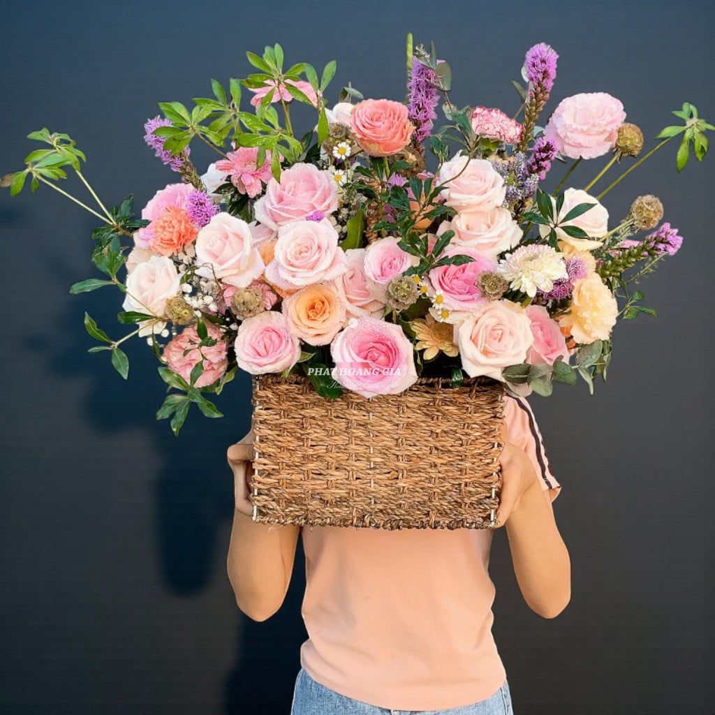 Với thiết kế tinh tế và sự kết hợp hài hòa của những gam màu dịu dàng, giỏ hoa toát lên vẻ đẹp thanh lịch, sang trọng. Màu sắc chủ đạo nhẹ nhàng, tươi sáng, tạo nên một tổng thể hài hòa, lôi cuốn. Hoa được cắm một cách khéo léo, tôn lên nét đẹp tự nhiên, mềm mại, khiến người ta không thể rời mắt.