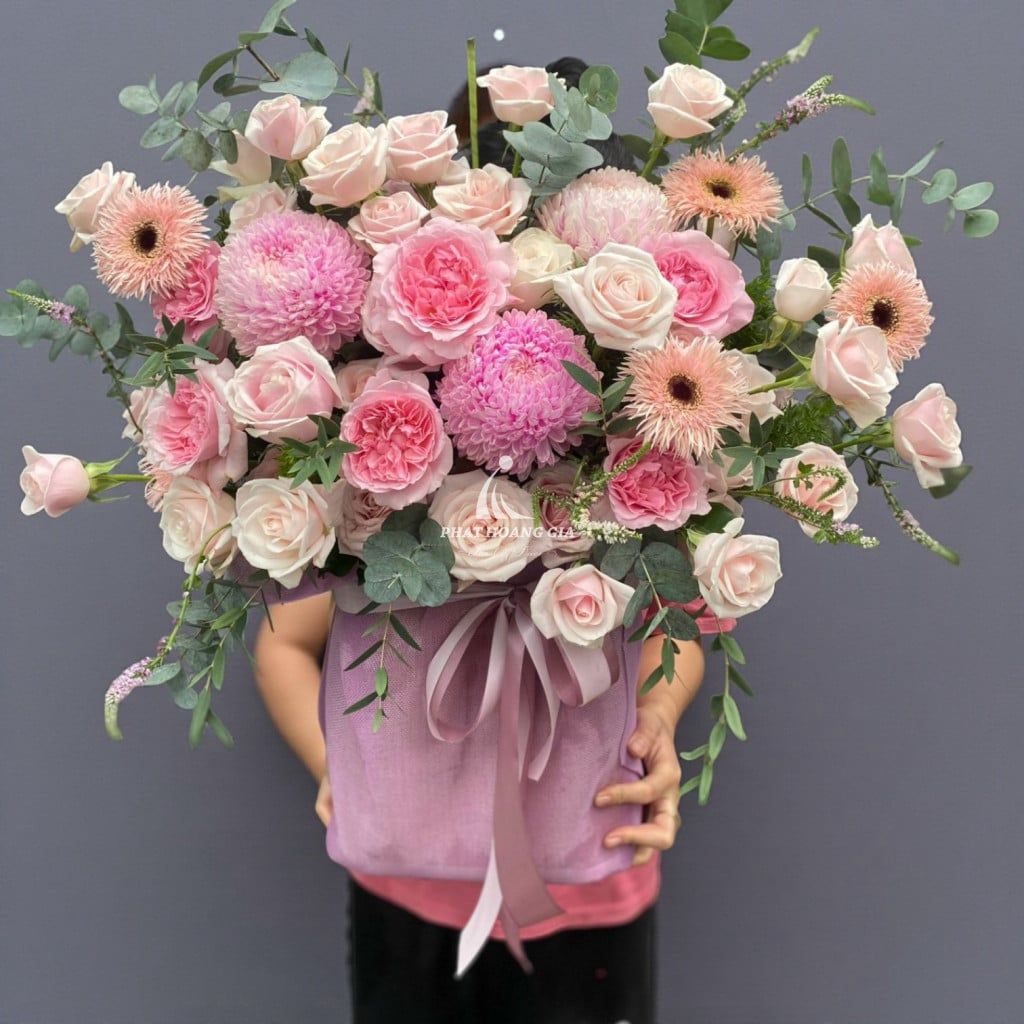 Bó hoa này được thiết kế với phong cách hiện đại nhưng không kém phần sang trọng, hoa mỹ. Gam màu chủ đạo là sự hòa quyện tinh tế giữa những sắc thái nhẹ nhàng và thanh lịch, tạo nên một tổng thể hài hòa, dễ chịu. Mỗi màu sắc đều được chọn lựa cẩn thận để tôn lên vẻ đẹp riêng biệt của từng loài hoa, từ đó làm nổi bật thông điệp mà bó hoa muốn gửi gắm.