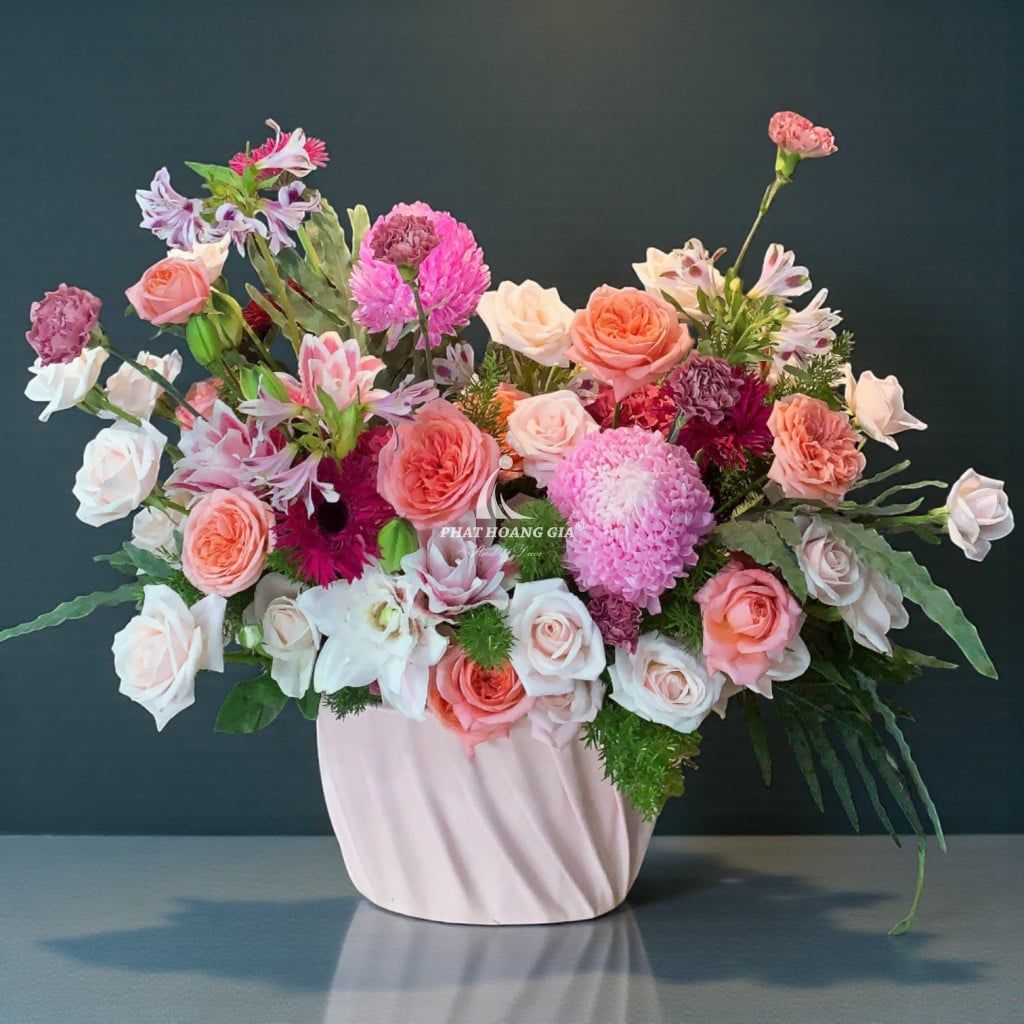 Sắc Đẹp 8 được thiết kế với phong cách hiện đại nhưng vẫn giữ được vẻ sang trọng, tinh tế. Sự phối hợp màu sắc hài hòa, từ những gam màu pastel nhẹ nhàng đến những tông màu ấm áp, tạo nên sự cân bằng tuyệt mỹ. Bố cục được sắp xếp khéo léo, tạo nên sự uyển chuyển và sức sống, khiến người nhìn không khỏi trầm trồ trước vẻ đẹp hoàn mỹ của từng bông hoa.