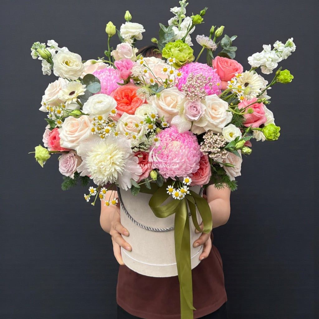 Thiết kế của bó hoa này mang phong cách hiện đại, sang trọng, kết hợp tinh tế giữa những gam màu pastel dịu mắt. Sự hòa quyện khéo léo giữa các sắc thái màu sắc tạo nên một bức tranh sống động, tuy nhẹ nhàng nhưng không kém phần cuốn hút. Mỗi bông hoa đều được chăm chút tỉ mỉ, tựa như từng nét vẽ trên một bức tranh nghệ thuật, khiến người ta không thể rời mắt.