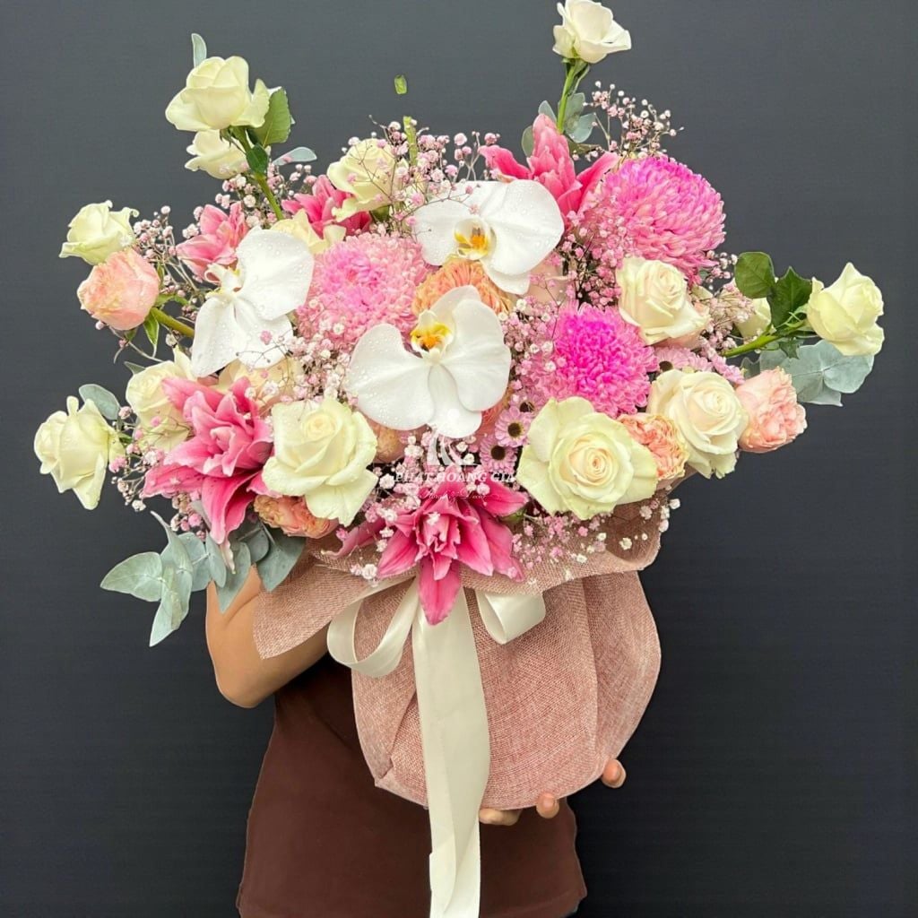 Bó hoa được thiết kế với phong cách hiện đại, sang trọng, với sự phối hợp màu sắc nhẹ nhàng nhưng đầy sức sống. Những gam màu tươi sáng đan xen cùng tông màu trầm ấm tạo nên một tổng thể hài hòa, cuốn hút. Đường nét mềm mại, tinh tế của từng cánh hoa tạo nên một vẻ đẹp tổng thể đầy ấn tượng, như một tác phẩm nghệ thuật sống động.