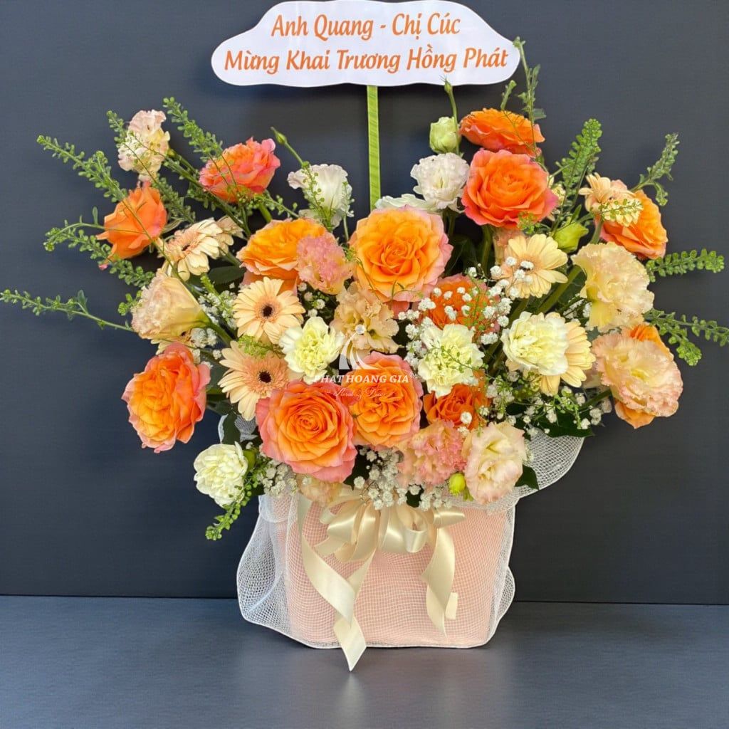 Bó hoa mang phong cách hiện đại nhưng không kém phần sang trọng, với sự kết hợp hài hòa giữa các màu sắc tươi sáng và thanh lịch. Tông màu chủ đạo nhẹ nhàng nhưng không kém phần nổi bật, từ sắc trắng thuần khiết đến những gam màu rực rỡ, tạo nên một tác phẩm nghệ thuật đầy cuốn hút. Sự sắp xếp tỉ mỉ và khéo léo trong từng chi tiết làm nổi bật vẻ đẹp tự nhiên, mang lại cảm giác hài hòa và tinh tế.