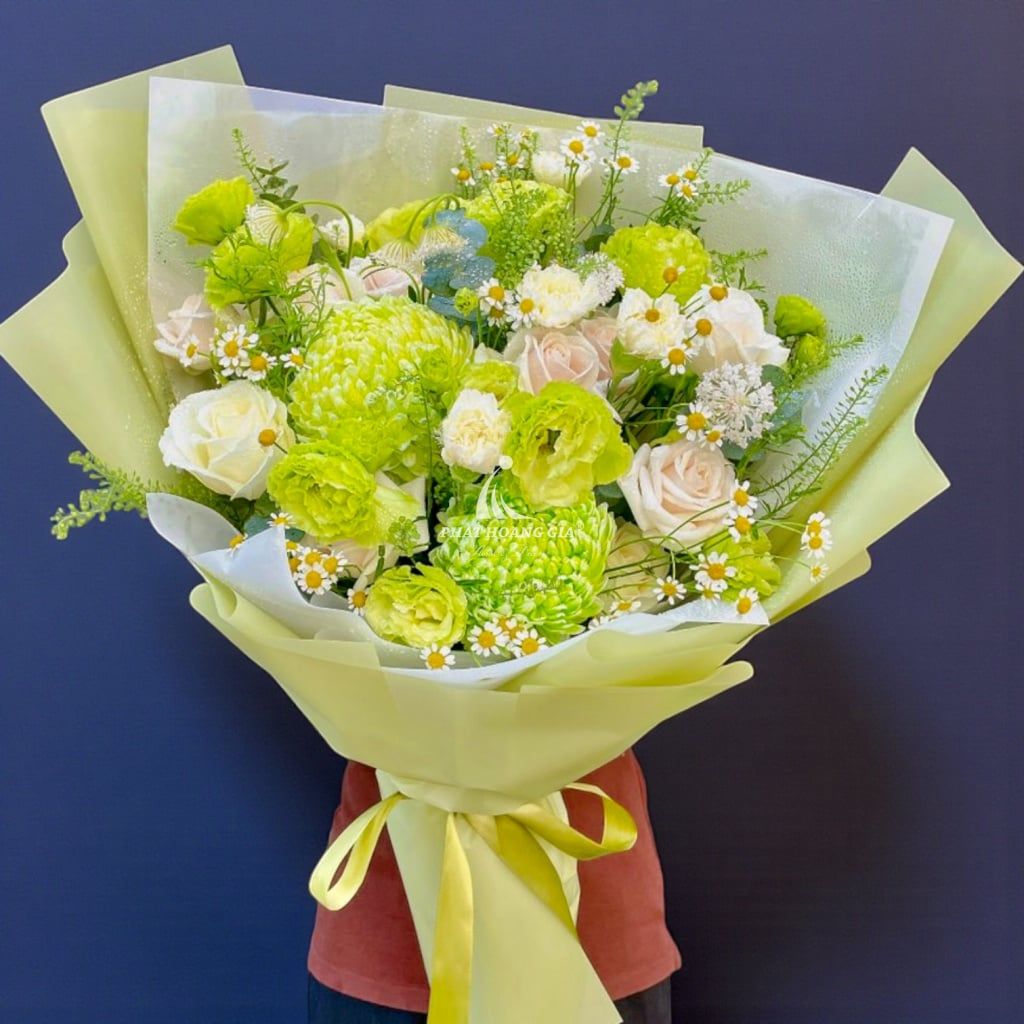 Bó hoa này nổi bật với phong cách hiện đại, thanh lịch, mang đến sự hài hòa tuyệt đối giữa các gam màu tinh khiết. Sự sắp xếp khéo léo tạo nên một tác phẩm nổi bật, không phô trương nhưng lại gây ấn tượng mạnh mẽ. Màu sắc được lựa chọn tinh tế, từ những tông màu nhẹ nhàng đến những sắc thái đậm đà, tất cả cùng hòa quyện tạo nên một tổng thể sang trọng và quý phái.