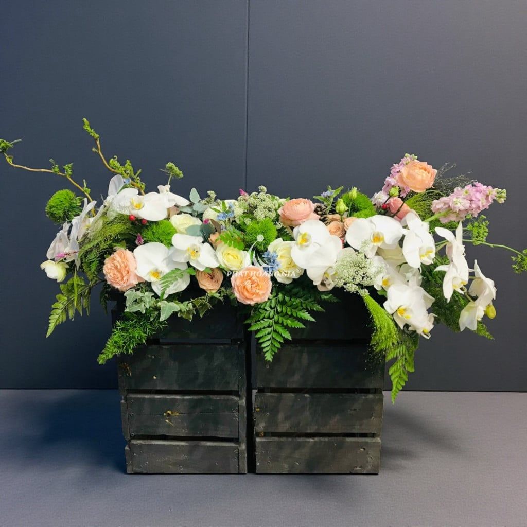 Một số hoa phụ, lá trang trí hoặc phụ kiện có thể được thay thế bằng loại tương tự (về màu sắc, kiểu dáng, giá trị) tùy tình trạng sẵn có, nhưng vẫn đảm bảo tính thẩm mỹ của sản phẩm.